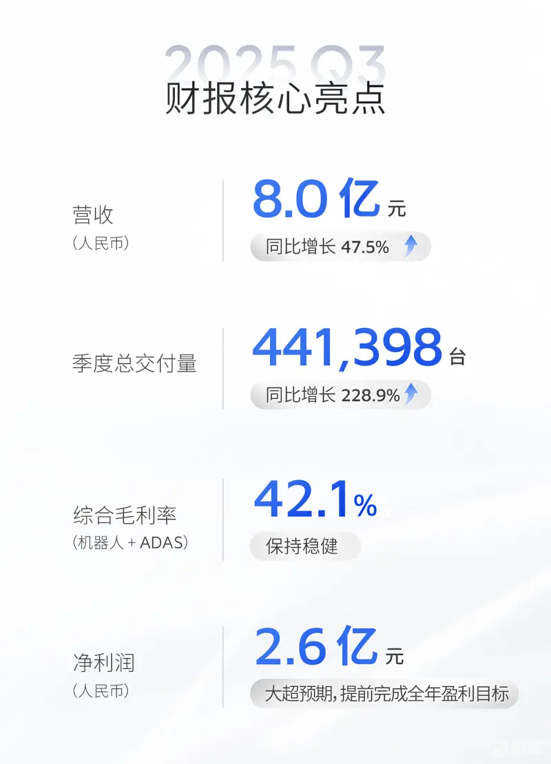 易车讯 11月11日,禾赛科技公布了2025年第三季度未经审计的财务数据。本季度,禾赛实现营收8.0亿元人民币,同比增长47.5%,连续六个季度同比增长。净利润达到2.6亿元人民币,创历史新高,提前一个季度完成全年盈利目标。激光雷达总交付量为441398台,其中 ADAS 产品交付量为380759台,同比增长193.1%,机器人领域产品交付量为60639台,同比大幅度增长1311.9%。