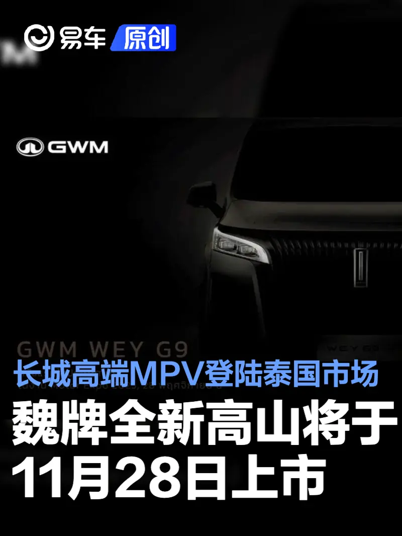易车讯 据相关媒体报道,长城汽车泰国公司计划于2025年11月28日在泰国国际车展(Motor Expo 2025)上,正式推出长城WEY品牌,全新车型GWM WEY G9(国内为全新高山)将同步上市。