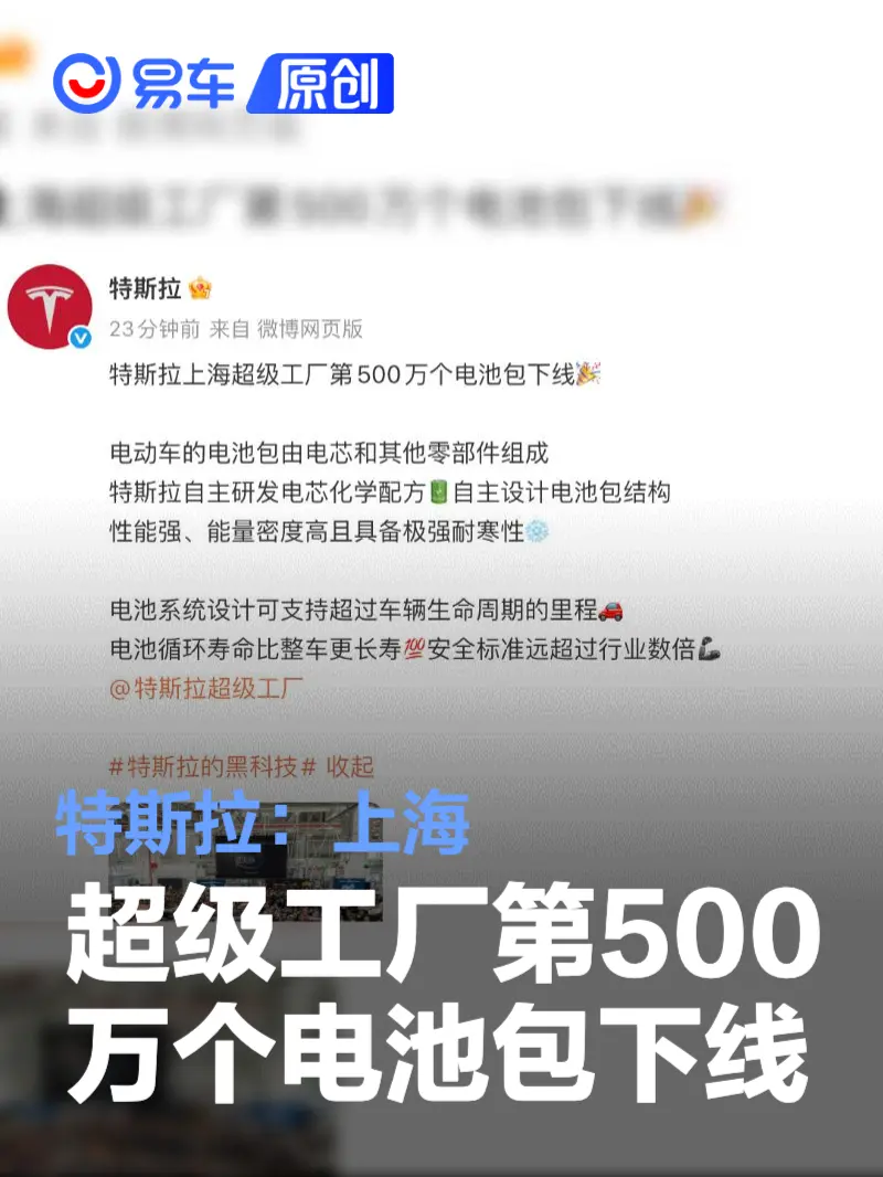 易车讯 11月12日,特斯拉官方宣布,特斯拉上海超级工厂第500万个电池包下线。官方介绍,电动车的电池包由电芯和其他零部件组成,特斯拉自主研发电芯化学配方,自主设计电池包结构,性能强、能量密度高且具备极强耐寒性。电池系统设计可支持超过车辆生命周期的里程,电池循环寿命比整车更长寿。