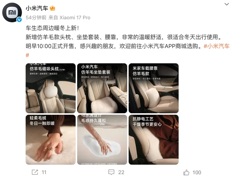 易车讯 11月17日,小米汽车官方宣布,车生态周边暖冬上新,新增仿羊毛款头枕、坐垫套装、腰靠等冬日配件,将于明早10:00正式开售,欢迎前往小米汽车APP商城选购。