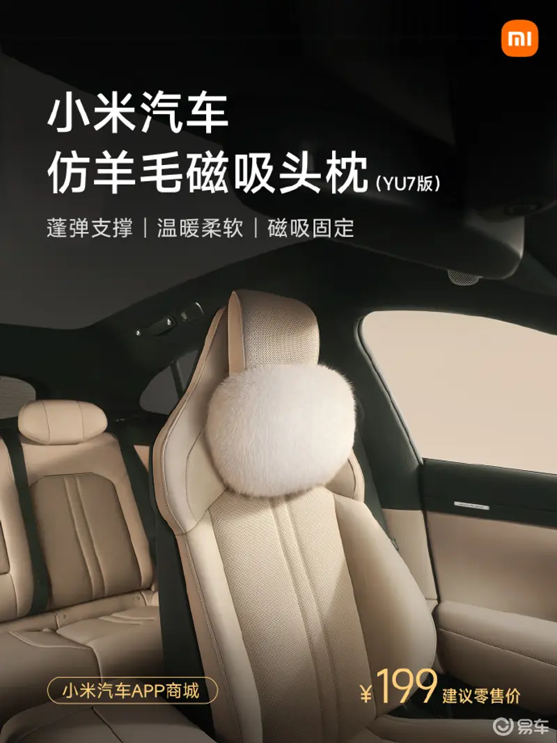 具体来看,小米汽车仿羊毛磁吸头枕(YU7 版),该头枕采用仿羊毛材质,柔软保暖,支持磁吸固定,适配小米YU7全车9处隐藏式磁吸点位,方便随时取用;同时小米汽车仿羊毛坐垫套装售价为399元,米家车载腰靠仿羊毛款售价199元。