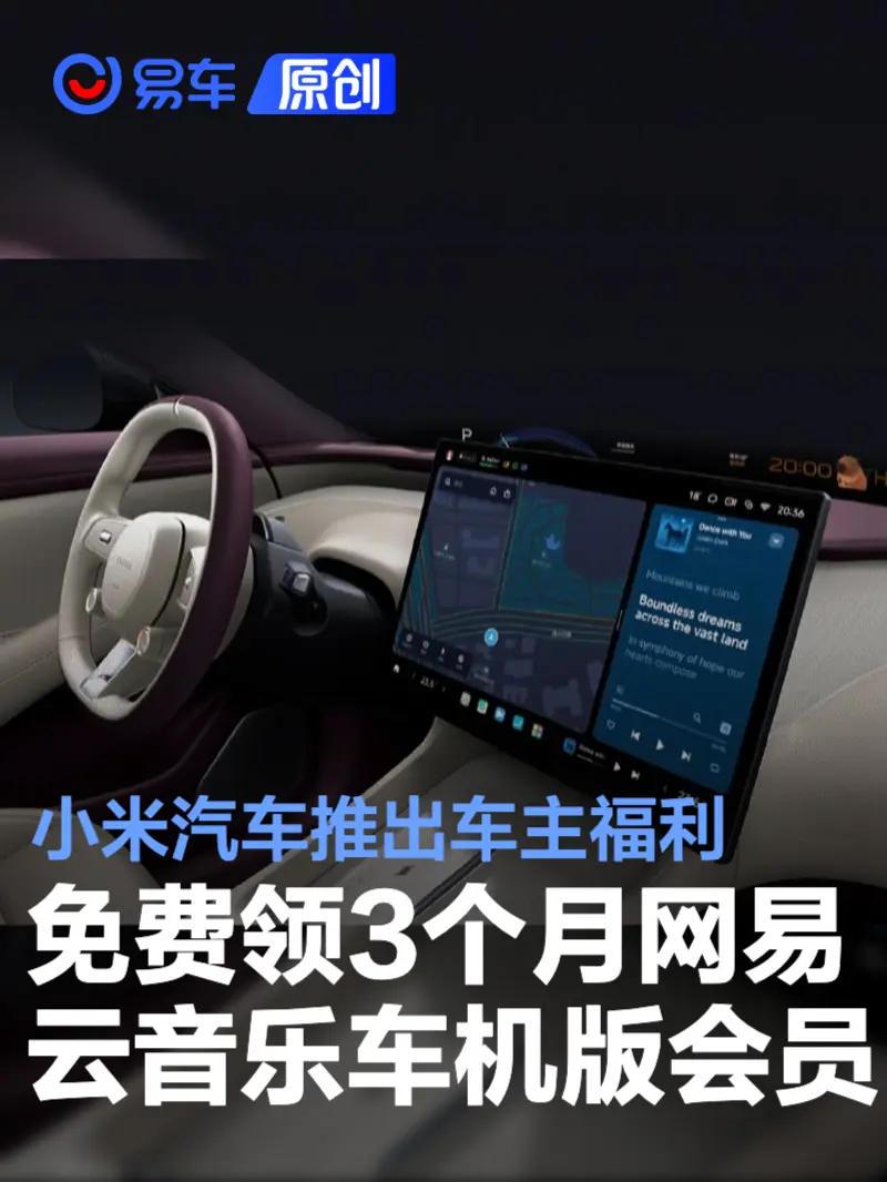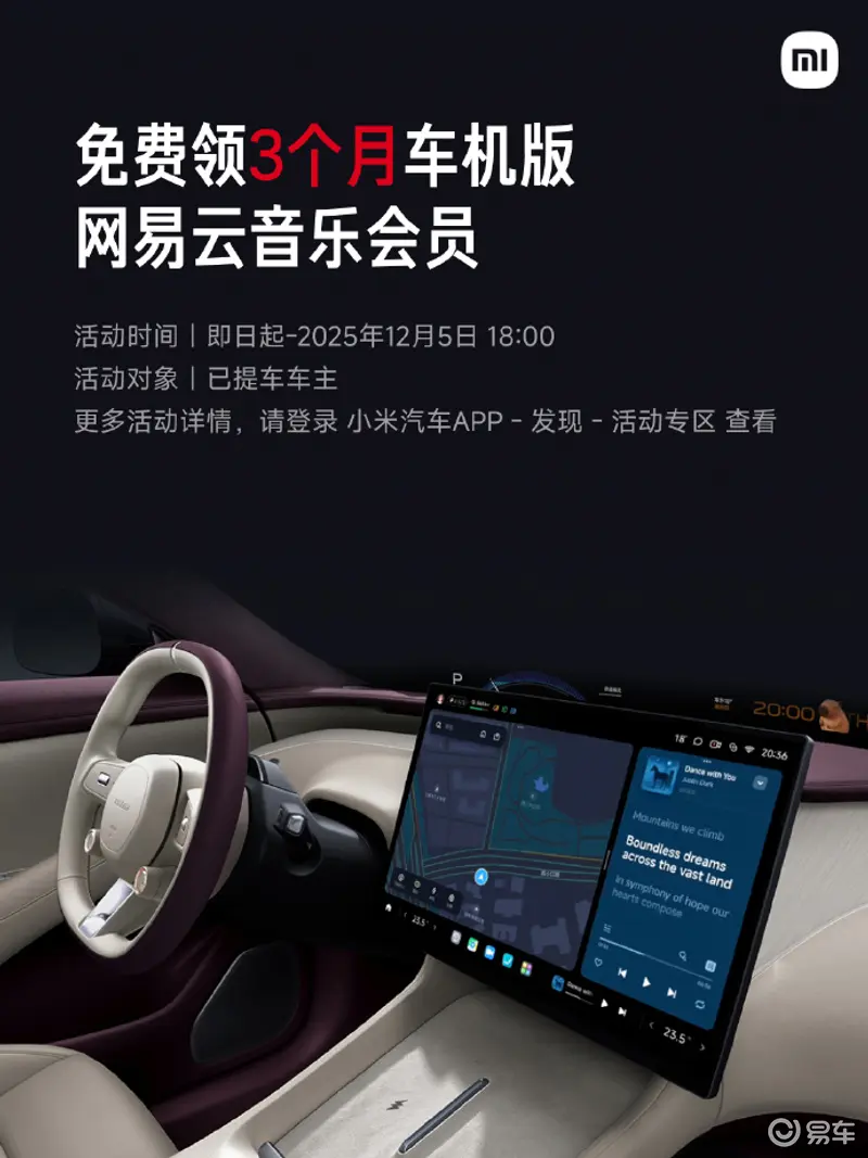 易车讯 日前,小米汽车官方宣布为车主提供一项福利,即日起至12月5日,所有已提车车主都可以在小米汽车APP活动专区,免费领取3个月网易云音乐车机会员。
