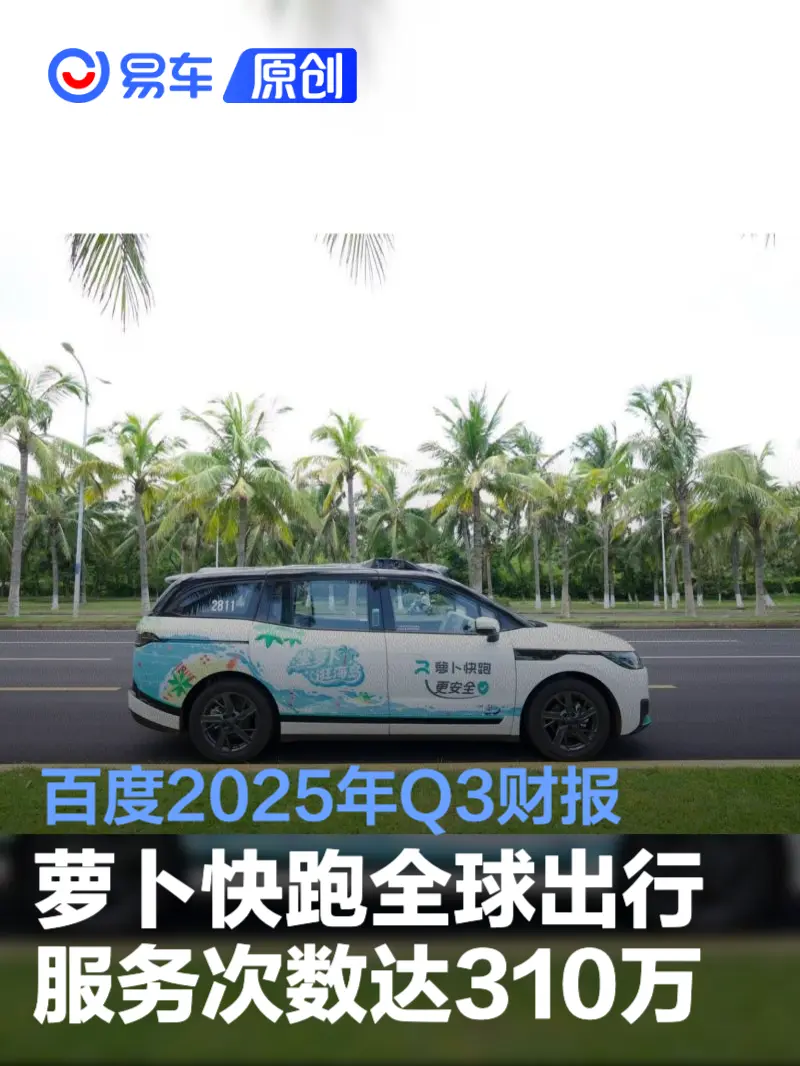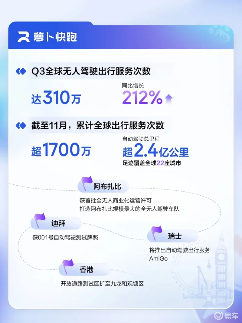 同时,萝卜快跑Q3全球出行服务次数达310万,同比增长212%,相较二季度的148%增速持续加速;10月,萝卜快跑每周全无人单量超25万;截至11月,累计全球出行服务次数超1700万。据了解,萝卜快跑足迹已覆盖全球22座城市,全无人驾驶里程突破了1.4亿公里,自动驾驶的总里程超过2.4亿公里。