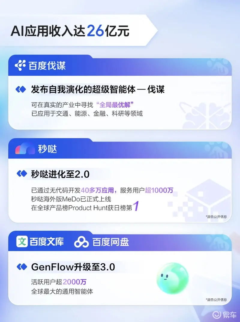 AI应用方面,Q3收入达26亿元。财报显示,AI应用涵盖了百度文库、百度网盘、数字员工等多款旗舰型产品,致力于解决个人和企业在特定场景下的不同需求。值得一提的是,大部分AI应用采用高粘性的订阅模式,可持续创造高质量收入。在百度世界2025上,百度文库和百度网盘联合推出的全端通用智能体GenFlow升级至3.0,活跃用户超2000万;无代码开发工具“秒哒”进化至2.0,已通过无代码开发40多万AI应用。会上,百度还发布了全球领先的、自我演化的超级智能体——伐谋。据悉,伐谋可在真实的产业中寻找“全局最优解”,已应用于金融、能源、交通、物流、科研等领域。
