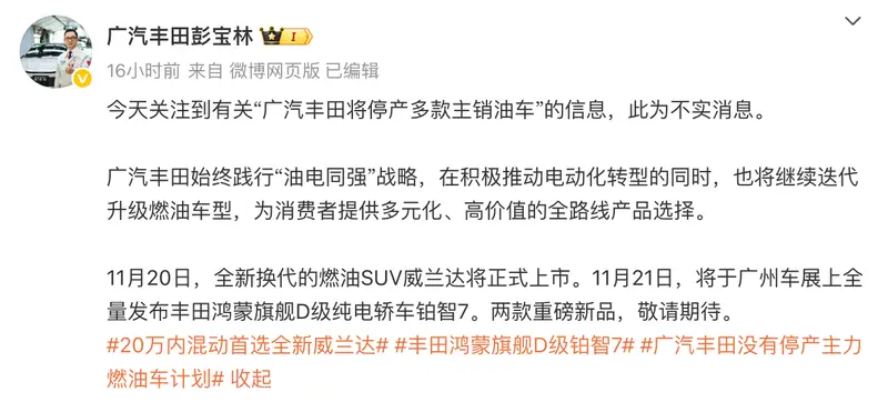 易车讯 日前,广汽丰田销售副总彭宝林在社交媒体表示,关注到有关“广汽丰田将停产多款主销油车”的信息,此为不实消息。
