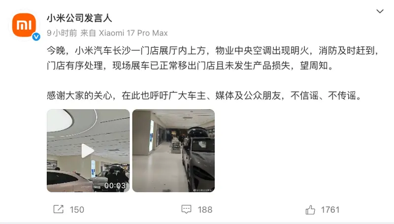 小米公司发言人表示,感谢大家的关心,在此也呼吁广大车主、媒体及公众朋友,不信谣、不传谣。