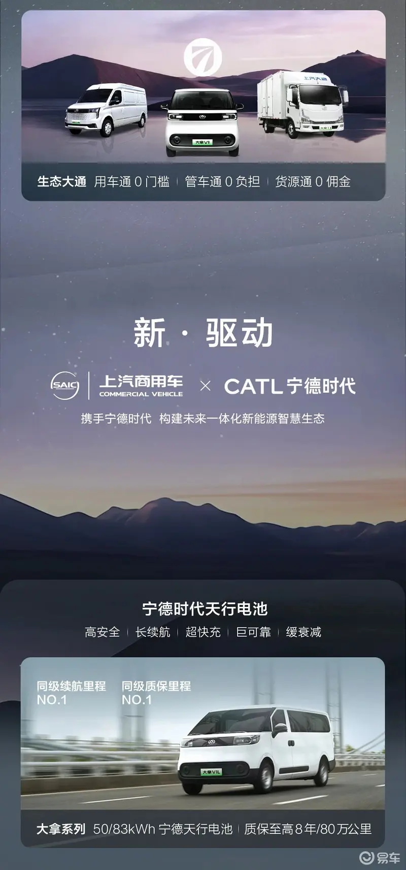 双方合作的宁德天行电池搭载于大拿V1L,带来同级最长的8年80万公里质保与 CLTC 535km续航;发布的大拿Robovan、RoboBUS,达成宁德时代与上汽商用车首个无人换电合作。此外,双方还将共建生态:发力公共领域电动化与交能融合,推进充换一体基建建设,打造智慧城市低碳物流平台,并携手生态出海,助力高质量发展。