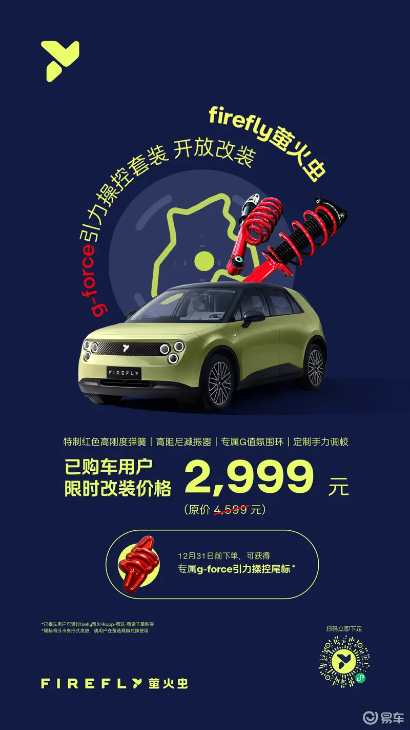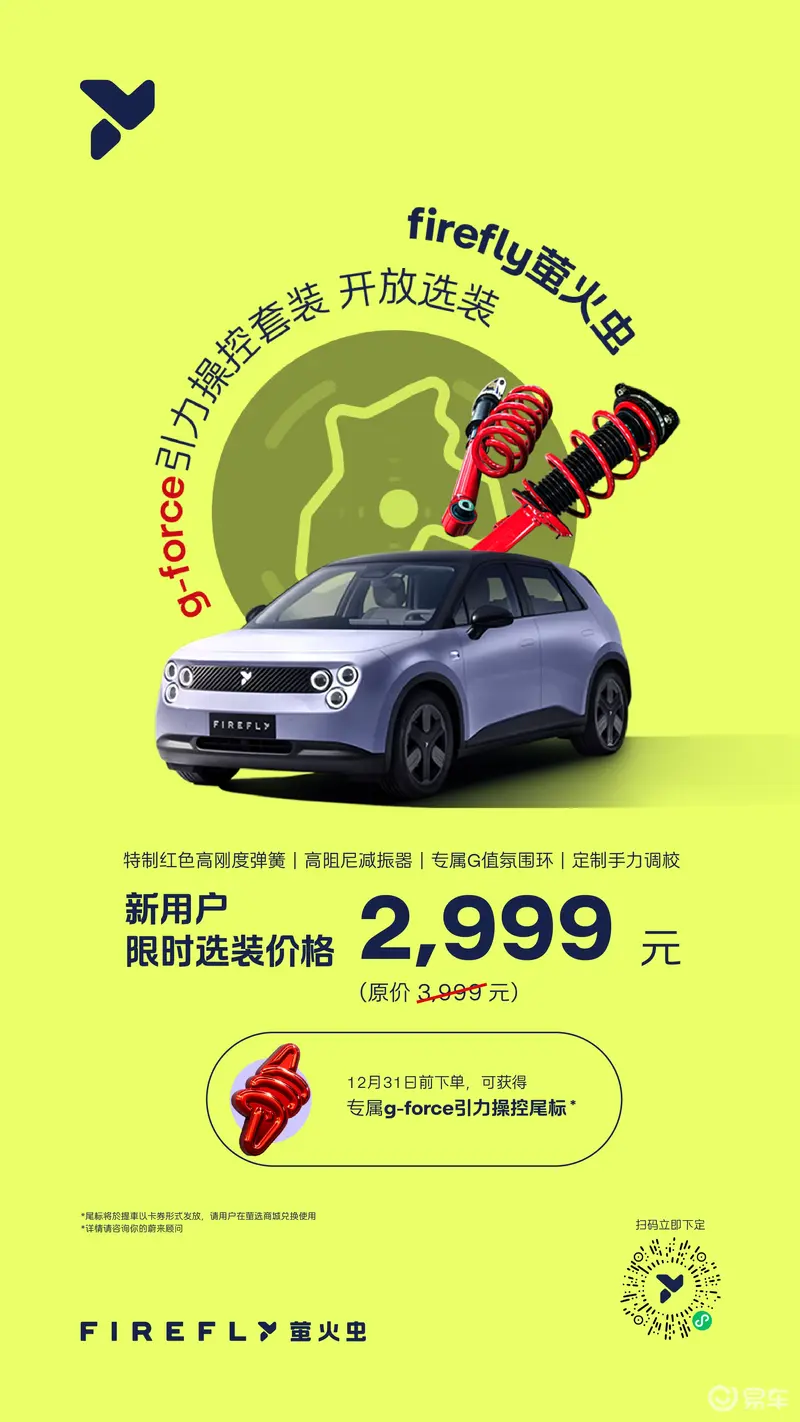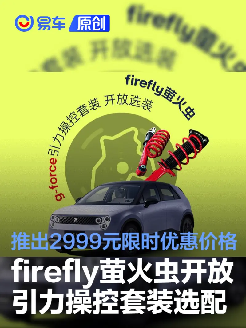 易车讯 11月22日,firefly萤火虫宣布正式向所有用户开放g-force引力操控套装选配,11月22日起,新用户3999元可选装、已购车用户4599元可改装。12月31日前,新老用户均可享受2999元限时优惠价格,更可获得的g-force引力操控尾标专属标识。