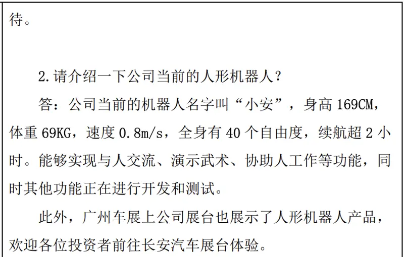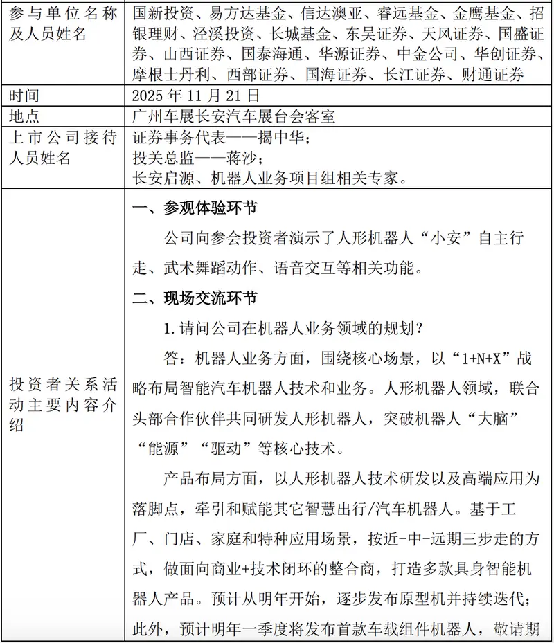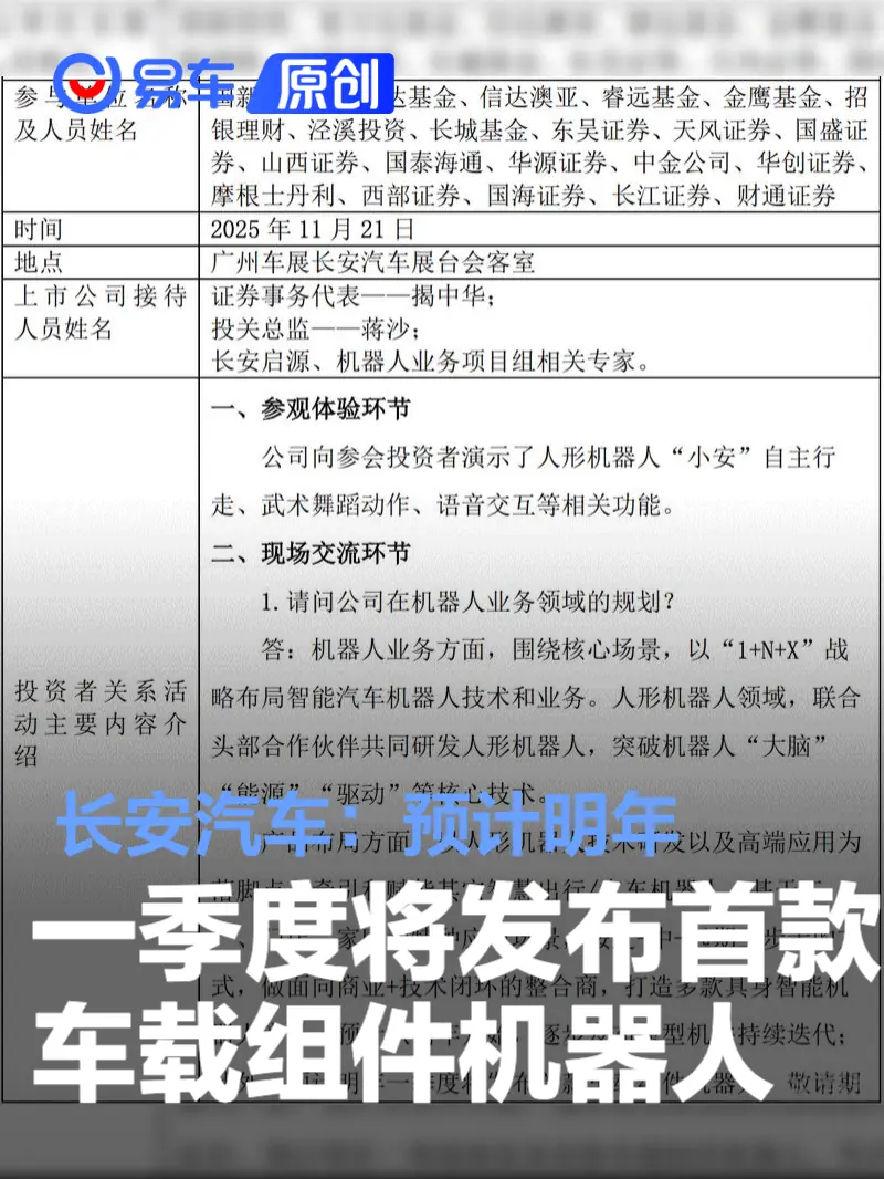 易车讯 11月24日,长安汽车发布投资者关系活动记录表,机器人业务规划方面,公司基于工厂、门店、家庭和特种应用场景,按近-中-远期三步走的方式,做面向商业+技术闭环的整合商,打造多款具身智能机器人产品。预计从明年开始,逐步发布原型机并持续迭代;此外,预计明年一季度将发布首款车载组件机器人。