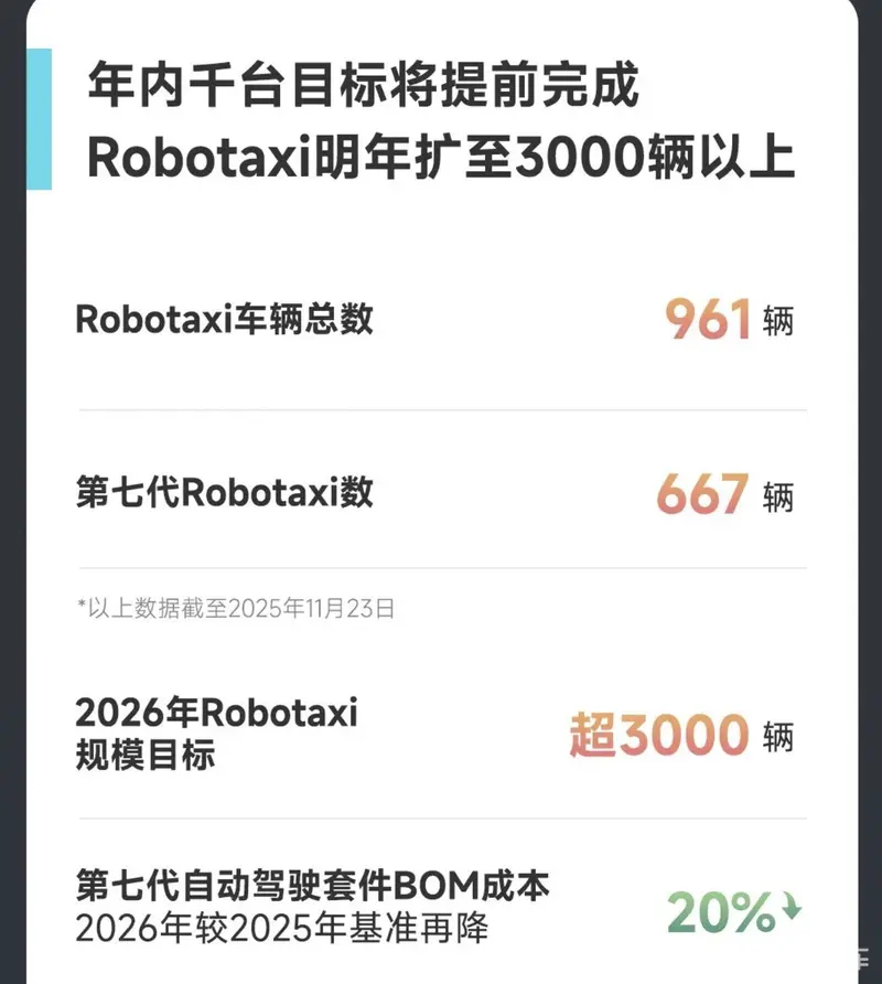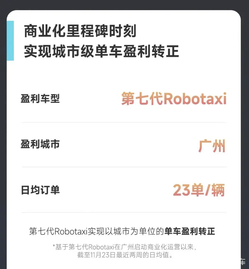 实现城市级单车盈利转正,盈利车型为第七代Robotaxi,盈利城市为广州,日均订单为23单/辆。年内前台目标将提前完成,Robotaxi明年将扩至3000辆以上。