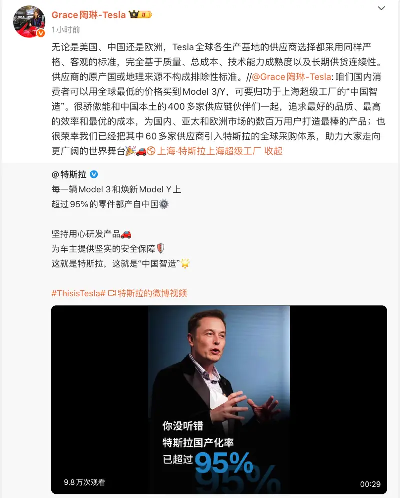 易车讯 11月26日,特斯拉副总裁陶琳发文称:无论是美国、中国还是欧洲,特斯拉全球各生产基地的供应商选择都采用同样严格、客观的标准,完全基于质量、总成本、技术能力成熟度以及长期供货的连续性,供应商的原产国或地理来源不构成排除性标准。