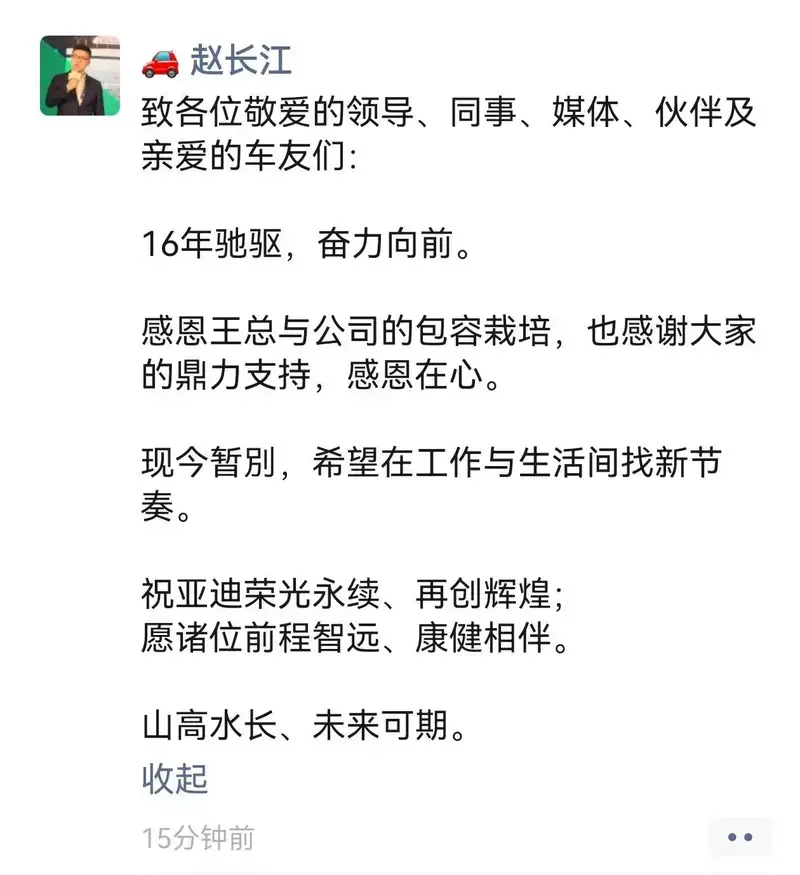 10月24日,腾势方程豹直营事业部总经理赵长江在朋友圈确认离职。赵长江表示,16年驰驱,奋力向前。感恩王总与公司的包容栽培,也感谢大家的鼎力支持,感恩在心。现今暂別,希望在工作与生活间找新节奏。祝亚迪荣光永续、再创辉煌;愿诸位前程智远、康健相伴。山高水长、未来可期。(信息来源 界面电厂)
