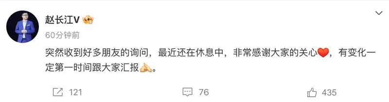 对此赵长江回应表示,“突然收到好多朋友的询问,最近还在休息中,非常感谢大家的关心,有变化一定第一时间跟大家汇报。 ”