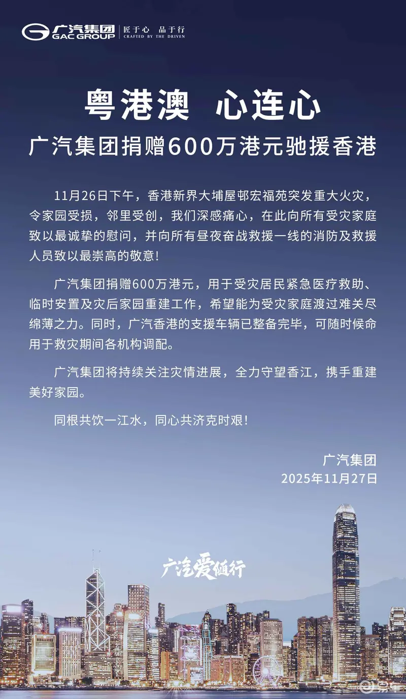 11月26日下午,香港新界大埔屋邨宏福苑突发重大火灾,令家园受损,邻里受创,我们深感痛心,在此向所有受灾家庭致以最诚挚的慰问,并向所有昼夜奋战救援一线的消防及救援人员致以最崇高的敬意!广汽集团将持续关注灾情进展,全力守望香江,携手重建美好家园。同根共饮一江水,同心共济克时艰!