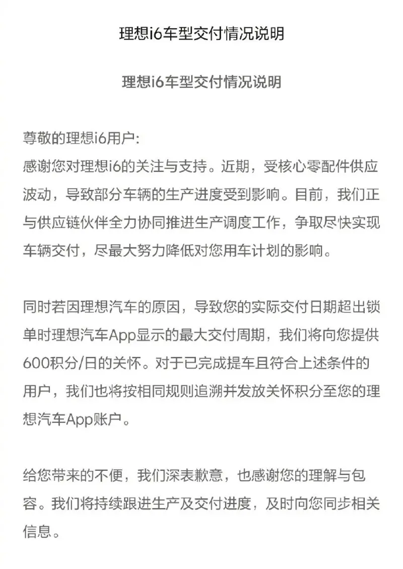易车讯 日前,理想汽车App发布《关于理想i6交付情况的说明及用户关怀方案》,针对近期因核心零部件供应波动致使理想i6车型交付延期的情况,向用户正式致歉,并公布具体关怀措施。