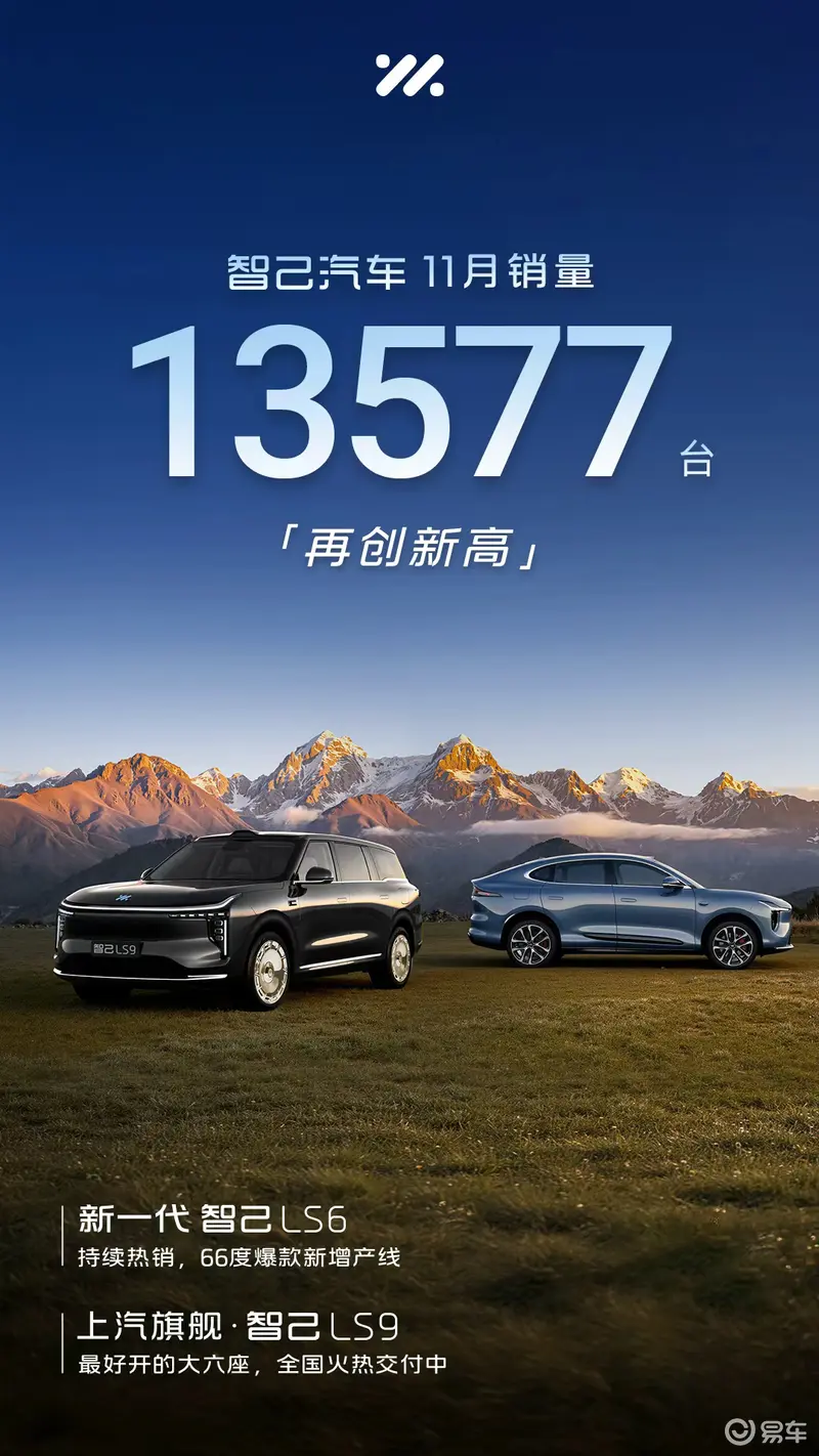 易车讯 12月1日,智己汽车公布2025年11月销量,达13,577台,首次实现连续三月破万,且接连三个月刷新品牌月销纪录。