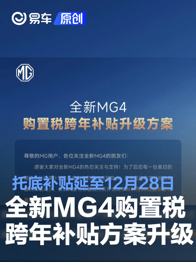 全新MG4购置税跨年补贴方案升级 托底补贴延至12月28日 2025-12-01 11:20 来源:汽车产经网 作者:易车原创报道 举报 易车讯 12月1日,上汽MG官方发布全新MG4购置税跨年补贴升级方案,购置税托底补贴政策从11月30日延长至12月28日。 具体来看,12月28日前(含)锁单全新MG4 437从容版、437自由版、530智趣版、半固态安芯版的客户,因非客户原因导致该锁定配置的车辆无法享受2025年购置税减免政策,享受购置税托底补贴。
