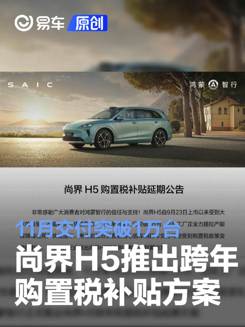 易车讯 12月2日,鸿蒙智行官方宣布尚界H5正式推出跨年购置税补贴延期方案。在2025年12月31日24:00前完成大定锁单,如因非用户原因车辆未及时到店交付,导致开票和车辆交付实际发生在2026年,则用户可享受跨年购置税全额补贴方案,预计至高 补贴金额9000元。