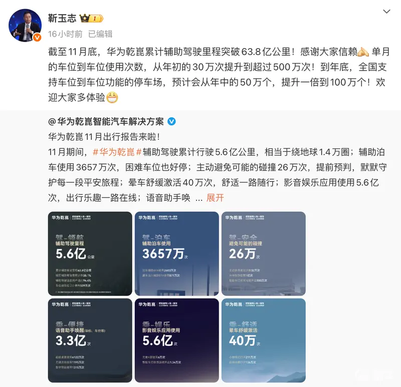 数据显示,截至11月底,华为乾崑累计辅助驾驶里程突破63.8亿公里。单月的车位到车位使用次数,从年初的30万次提升到超过500万次。11月份,辅助泊车使用3657万次,车位到车位2.0使用509万次。