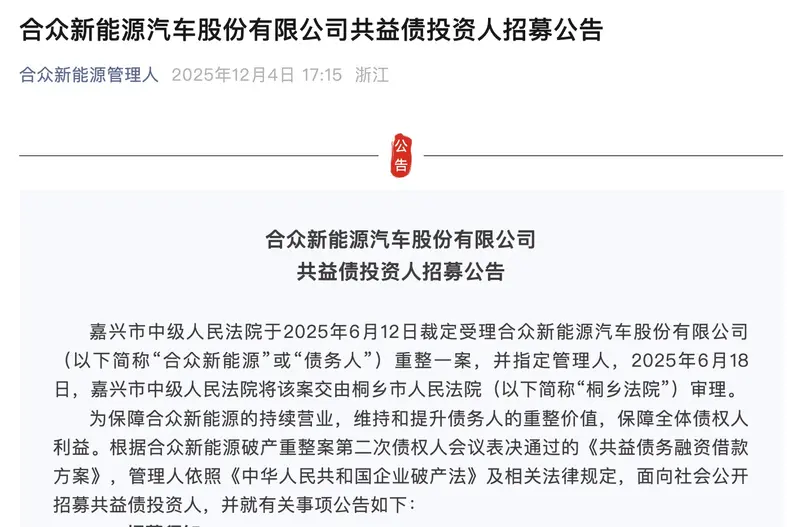 易车讯 12月4日,合众新能源管理人在官方公众号发布了《合众新能源汽车股份有限公司(哪吒汽车母公司)共益债投资人招募公告》。为保障合众新能源的持续营业,维持和提升债务人的重整价值,保障全体债权人利益。根据合众新能源破产重整案第二次债权人会议表决通过的《共益债务融资借款方案》,管理人依照《中华人民共和国企业破产法》及相关法律规定,面向社会公开招募共益债投资人,并就有关事项公告如下: