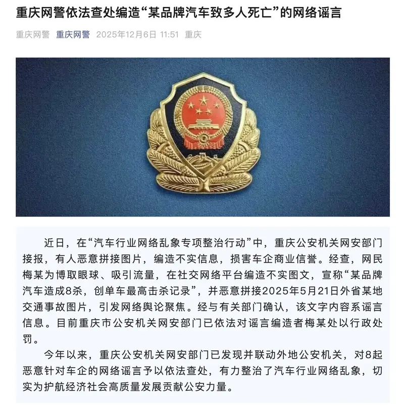 易车讯 近日,重庆网警在官号发文表示,在“汽车行业网络乱象专项整治行动”中,重庆公安机关网安部门接报,有人恶意拼接图片,编造不实信息,损害车企商业信誉。经查,网民梅某为博取眼球、吸引流量,在社交网络平台编造不实图文,宣称“某品牌汽车造成8杀,创单车最高击杀记录”,并恶意拼接2025年5月21日外省某地交通事故图片,引发网络舆论聚焦。经与有关部门确认,该文字内容系谣言信息。目前重庆市公安机关网安部门已依法对谣言编造者梅某处以行政处罚。