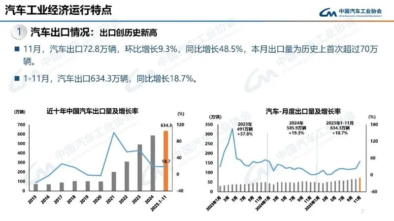 汽车出口创历史新高,11月,汽车出口72.8万辆,环比增长9.3%,同比增长48.5%,本月出口量为历史上首次超过70万辆。1-11月,汽车出口634.3万辆,同比增长18.7%。