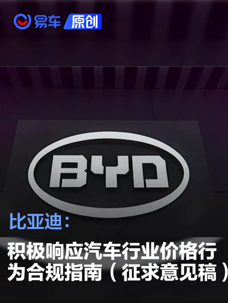 易车讯 12月12日,比亚迪在官方公众号发文表示,国家市场监督管理总局12月12日发布《汽车行业价格行为合规指南(征求意见稿)》(以下简称《指南》)公开征求意见。《指南》从汽车生产企业价格行为、销售企业价格行为、制度建设等方面,为维护汽车行业公平竞争秩序,保障消费者合法权益,促进产业链供应链健康可持续发展提供了明晰指引。