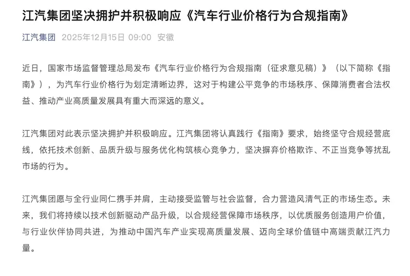 易车讯 日前,江汽集团在官方公众号发文表示,坚决拥护并积极响应《汽车行业价格行为合规指南》。将认真践行《指南》要求,始终坚守合规经营底线,依托技术创新、品质升级与服务优化构筑核心竞争力,坚决摒弃价格欺诈、不正当竞争等扰乱市场的行为。