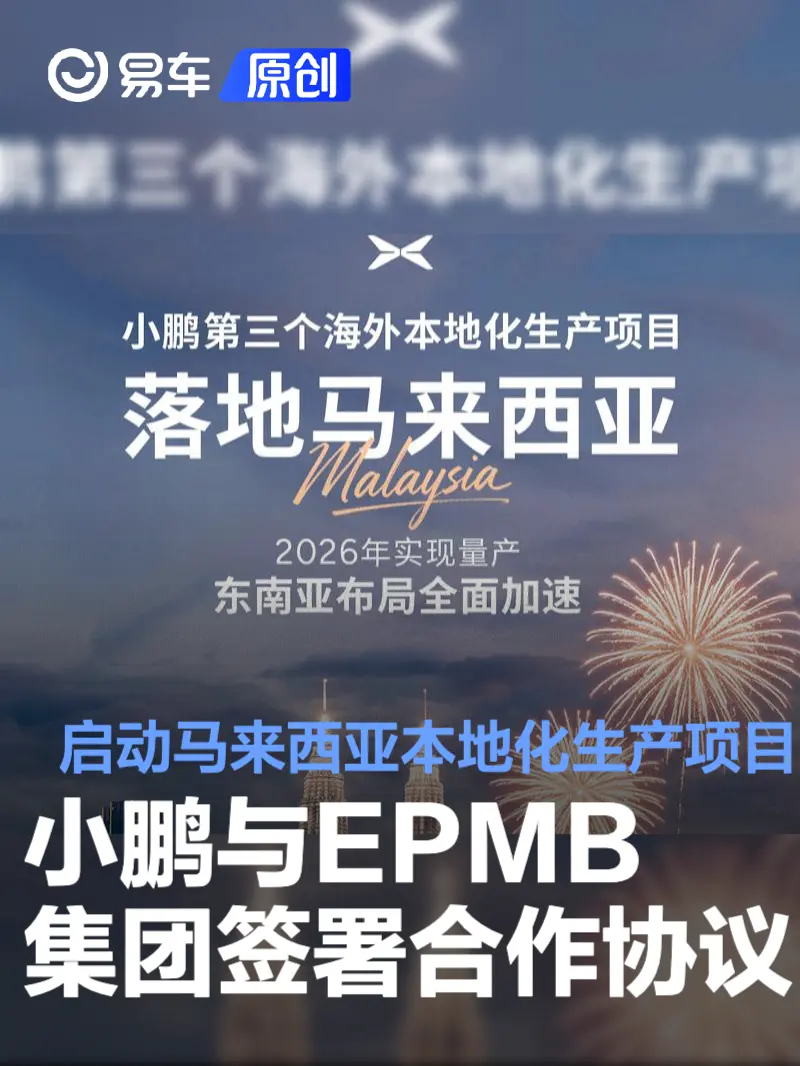 小鹏与EPMB集团签署合作协议 启动马来西亚本地化生产项目 2025-12-15 14:35 来源:汽车产经网 作者:易车原创报道 举报 易车讯 12月15日,小鹏汽车与马来西亚EPMB集团签署合作协议,正式启动马来西亚的本地化生产项目。这是继印尼、奥地利之后,小鹏在全球布局的第三个本地化生产项目。按计划,项目将于2026年实现量产,旨在打造服务整个东盟右舵车市场的战略枢纽。 今年1-10月,小鹏汽车成功跻身马来西亚当地纯电品牌销量前六;其中,小鹏X9在9月拿下马来西亚高端电动MPV销量冠军。 未来,小鹏汽车将进一步推动东南亚的本地化战略,为区域消费者提供更优质的产品与服务。