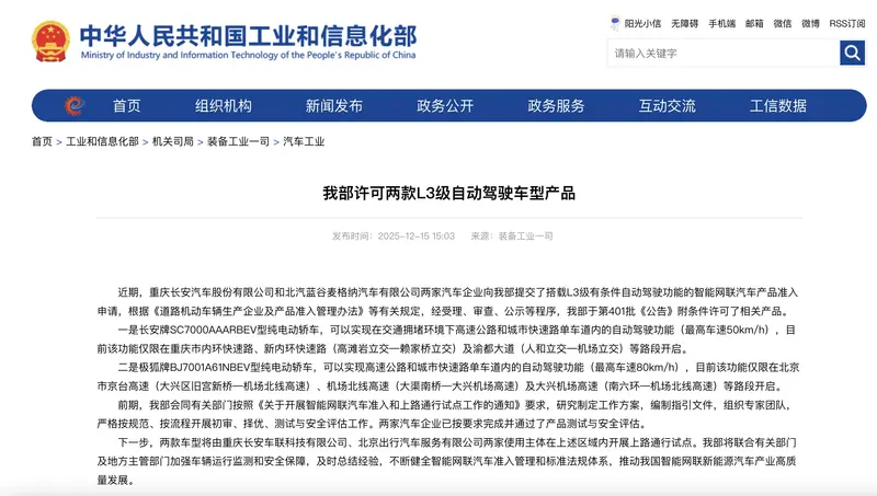 易车讯 12月15日,工信部在官网宣布,近期,重庆长安汽车股份有限公司和北汽蓝谷麦格纳汽车有限公司两家汽车企业向我部提交了搭载L3级有条件自动驾驶功能的智能网联汽车产品准入申请,根据《道路机动车辆生产企业及产品准入管理办法》等有关规定,经受理、审查、公示等程序,我部于第401批《公告》附条件许可了相关产品。