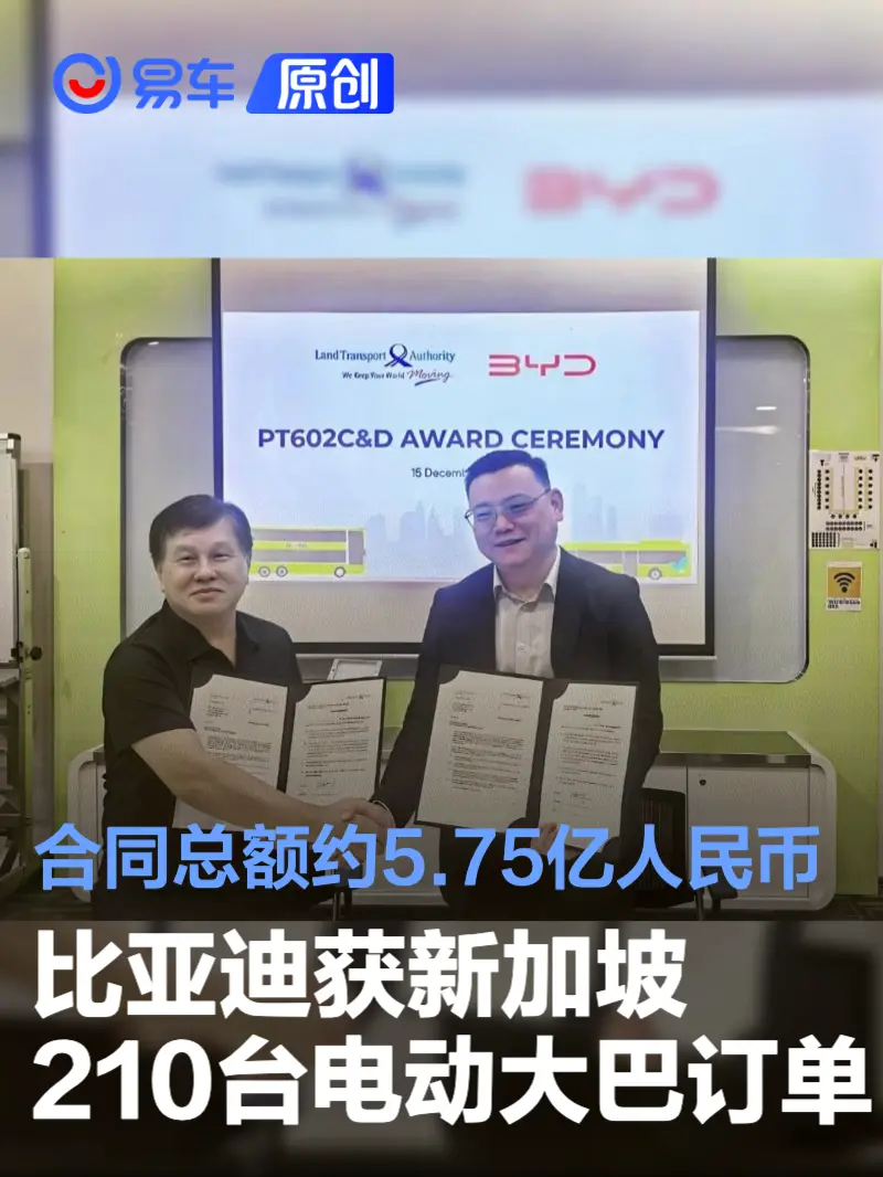 易车讯 日前,比亚迪获得新加坡陆路交通管理局(简称LTA)210台电动巴士订单,合同总额超1.05亿新加坡元(约5.75亿人民币)。此前,比亚迪在当地已运营超300台大巴,持续助力新加坡公共交通绿色转型。
