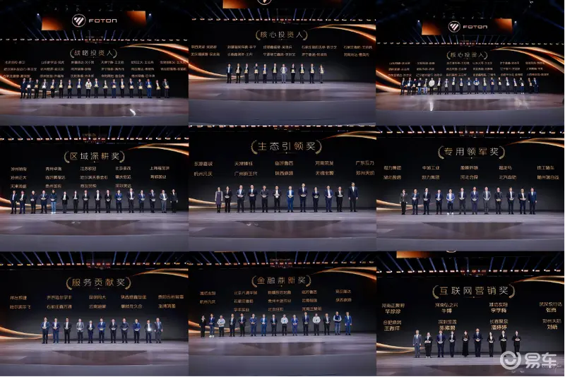 为凝聚合作伙伴共创未来的信心与决心,福田汽车常务副总经理鹿政华主持了核心投资人和战略投资人授牌仪式,现场为45位长期与公司同频共振的战略及核心投资人授牌,他们将获得"专属政策支持、专业人才培养、战略协同共创"等全方位赋能。同时,大会还对全年表现优异的经销商分别授予"区域深耕奖"、"生态引领奖"、“专用领军奖”、"服务贡献奖"、“金融领航奖”、“互联网营销奖”荣誉。