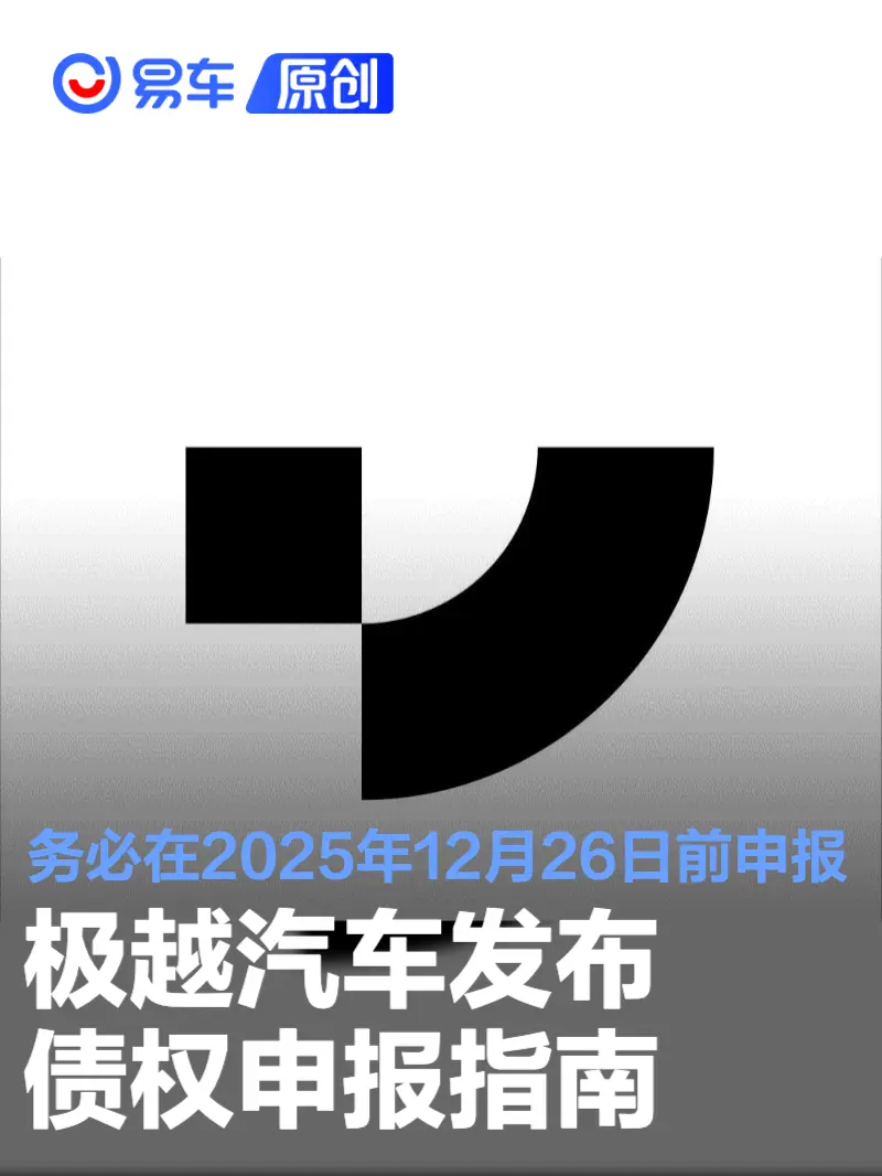 易车讯 12月19日,极越汽车在官方公众号发布《关于尽快办理债权申报及材料补正的公告》。为保障各位债权人顺利、规范办理债权申报事 宜现正式发布《债权申报指南》,并强调务必在2025年12月26日前申报债权。