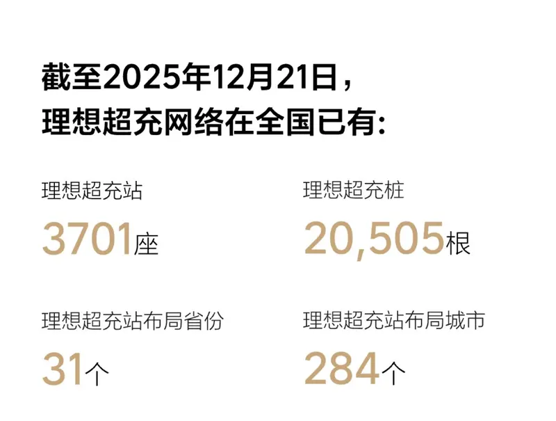 截至2025年12月21日,理想超充网络在全国已有3701座超充站,20505根超充桩。理想超充站布局省份31个,布局城市284个。