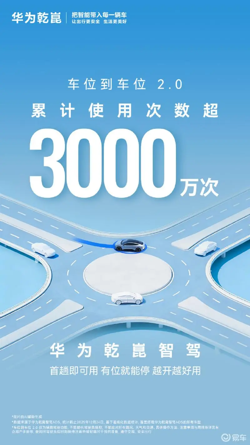 易车讯 12月25日,华为乾崑智能汽车解决方案微博官方宣布,华为乾崑智驾「车位到车位 2.0」迎来两大全新里程碑,全国支持停车场数量突破100万个,累计使用次数超3000万次。