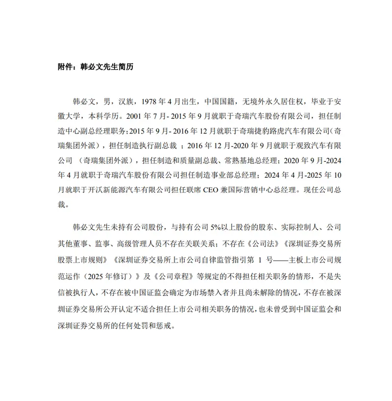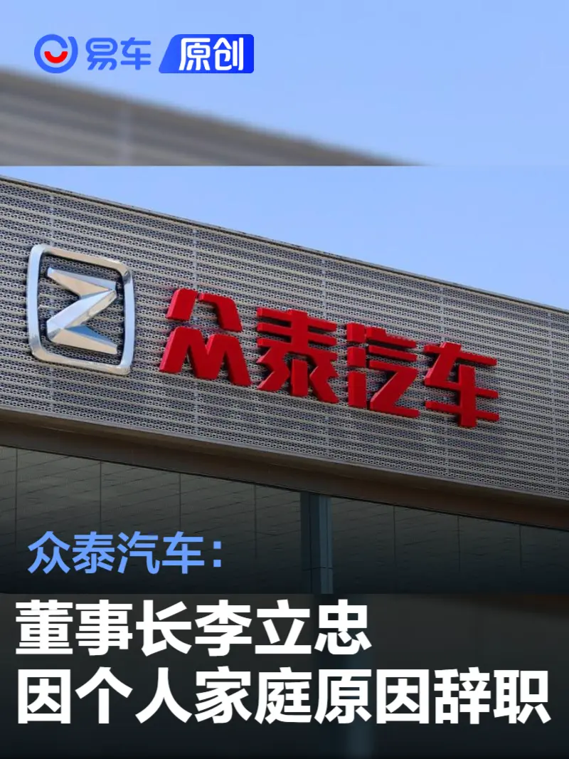 众泰汽车:董事长李立忠因个人家庭原因辞职 2025-12-29 19:27 来源:汽车产经网 作者:易车原创报道 举报 易车讯 12月29日,众泰汽车发布公告,公司董事长李立忠因个人家庭原因申请辞去董事长、董事职务,同时辞去董事会战略委员会主任委员、提名委员会委员职务,辞职后不再担任公司任何职务。 为保障公司董事会的正常运转并结合公司实际情况,董事会同意提名韩必文为公司第九届董事会非独立董事候选人,任期自股东会审议通过之日起至第九届董事会届满之日止。韩必文在从2001年至2025年期间,先后在奇瑞汽车、奇瑞捷豹路虎汽车、观致汽车、开沃新能源汽车任职。