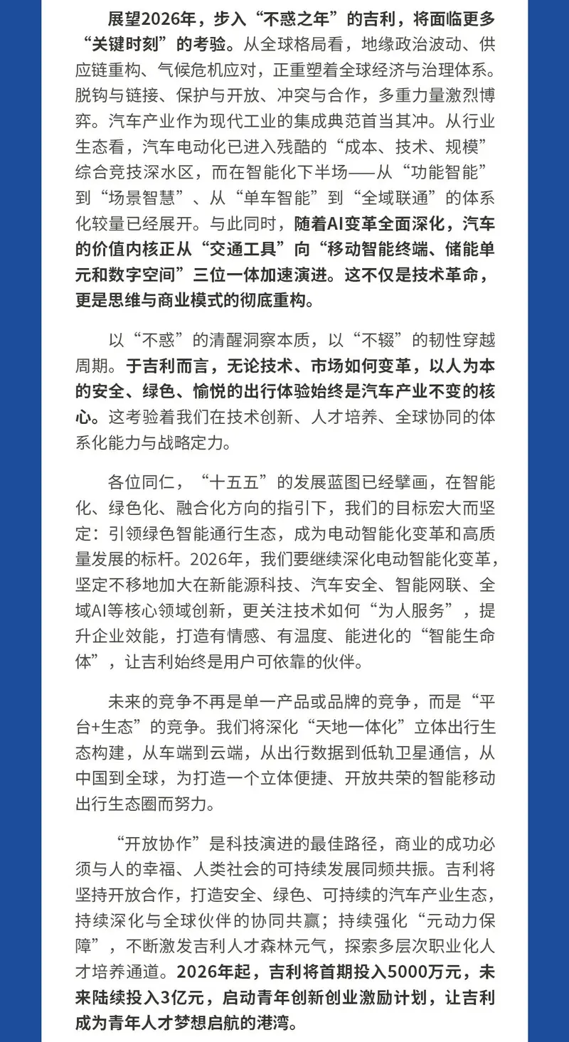 “开放协作”是科技演进的最佳路径,商业的成功必须与人的幸福、人类社会的可持续发展同频共振。吉利将坚持开放合作,打造安全、绿色、可持续的汽车产业生态:持续深化与全球伙伴的协同共赢;持续强化“元动力保障”,不断激发吉利人才森林元气,探索多层次职业化人才培养通道。2026年起,吉利将首期投入5000万元,未来陆续投入3亿元,启动青年创新创业激励计划,让吉利成为青年人才梦想启航的港湾。