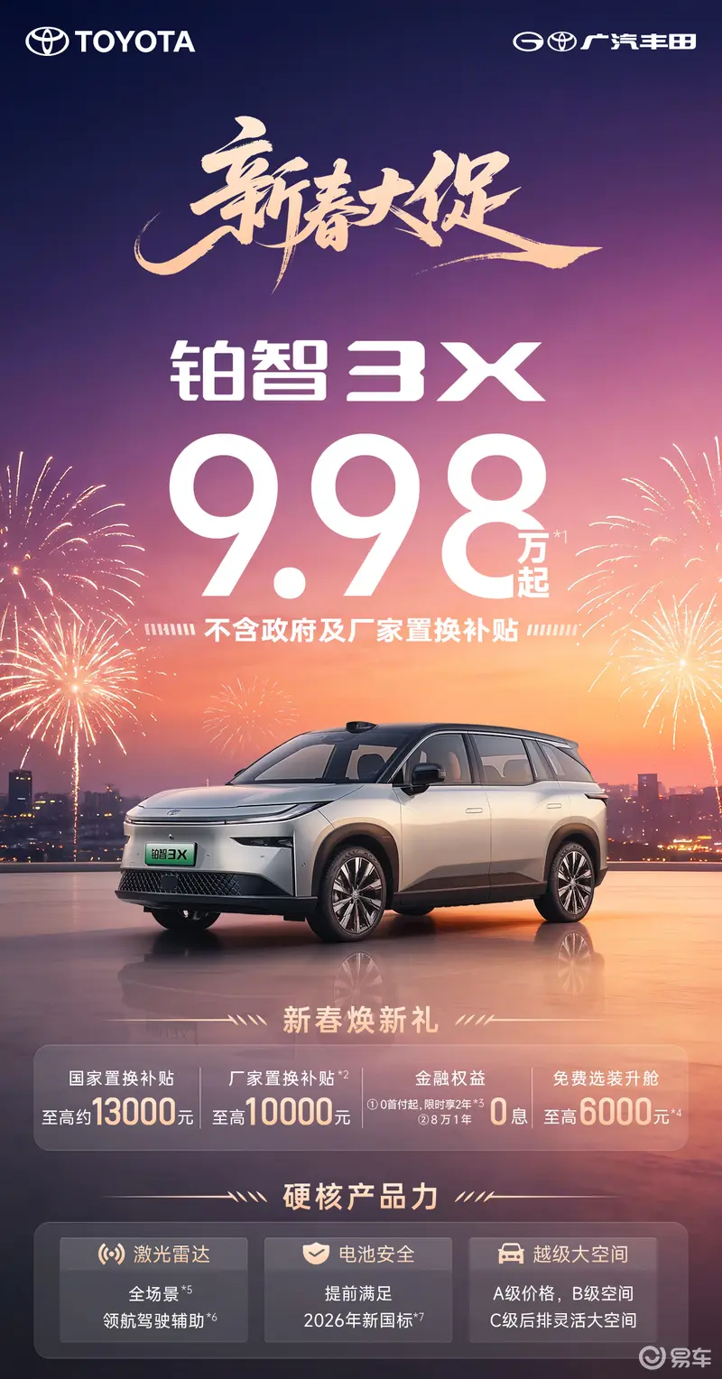 易车讯 1月5日,广汽丰田宣布旗下铂智3X新春限时大促,厂家直补1万元,补贴后售价区间为9.98-14.98万元。与此同时,用户购车依然可享至高1.3万元国补和至高1万元厂家补贴,需在1月1日-2月16日(含)期间下定并支付定金,且在3月31日(含)前完成开票。