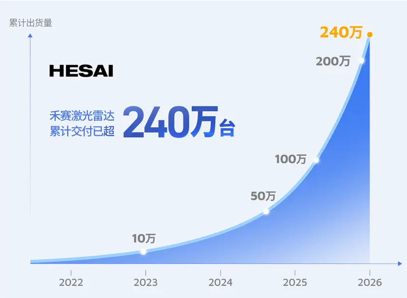 2025年,禾赛全年交付量超160万台,单月最高交付量超20万台,ADAS产品全年交付量约140万台,机器人产品全年交付量超20万台,ATX开启交付首年即突破100万台,全系激光雷达产品历史累计交付量已超240万台。