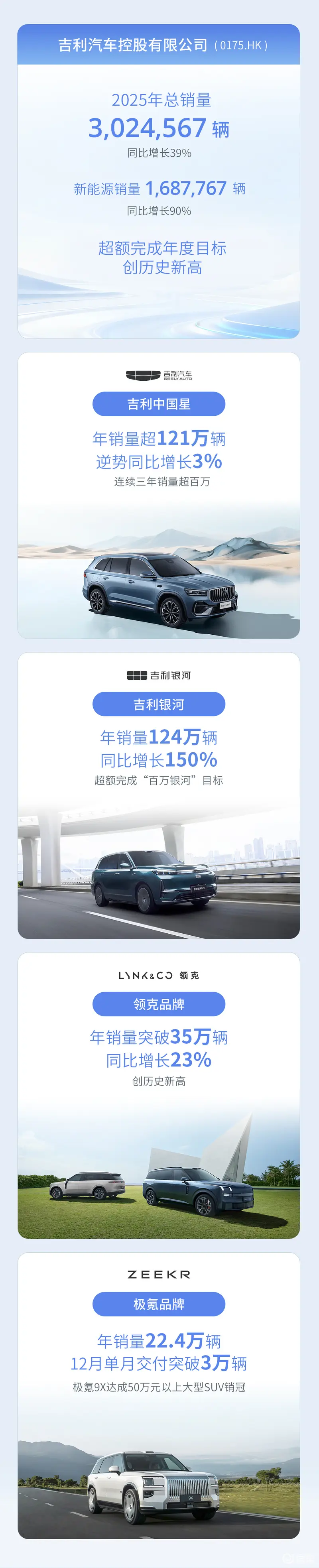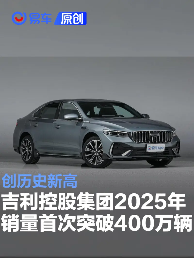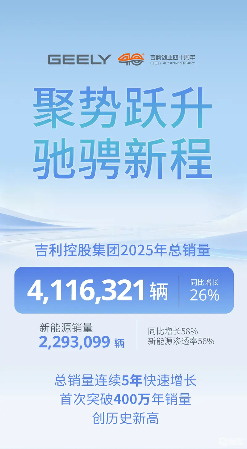 易车讯 今日,吉利控股集团发布2025全年销量:年销量412万辆,连续5年增长,首破400万大关。新能源年销量229万辆,同比增长58%,新能源渗透率达56%