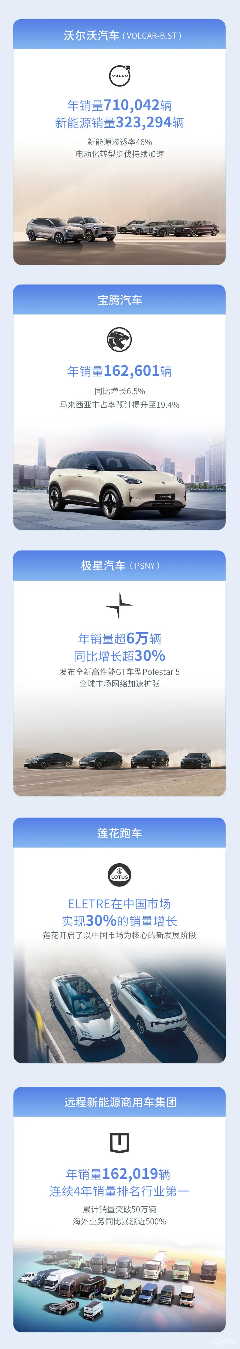 其中,吉利汽车控股有限公司(包含吉利中国星、银河、领克、极氪)年度总销量3024567辆,同比增长39%;新能源销量1687767辆,同比增长90%。超额完成年度目标。沃尔沃汽车年销量710042辆,新能源销量323294辆,新能源渗透率46%。宝腾汽车年销量162601辆,同比增长6.5%。极星汽车年销量超6万辆,同比增长超30%。莲花跑车中国市场30%销量增长。远程新能源商用车年销量162019辆,累计销量突破50万辆。