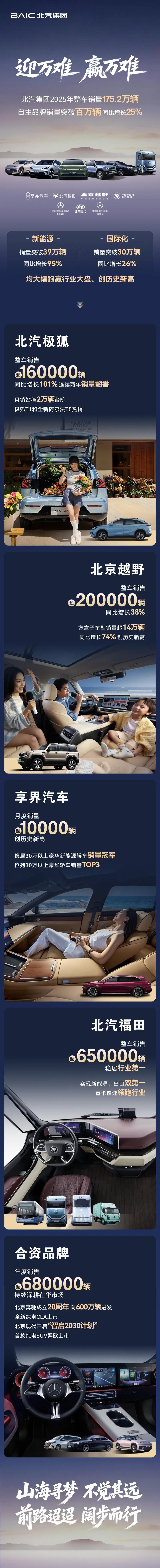本月初,北汽集团公布了2025年销量数据,整车销量175.2万辆,自主品牌销量突破百万辆,同比增长25%。其中,新能源销量突破39万辆,同比增长95%。