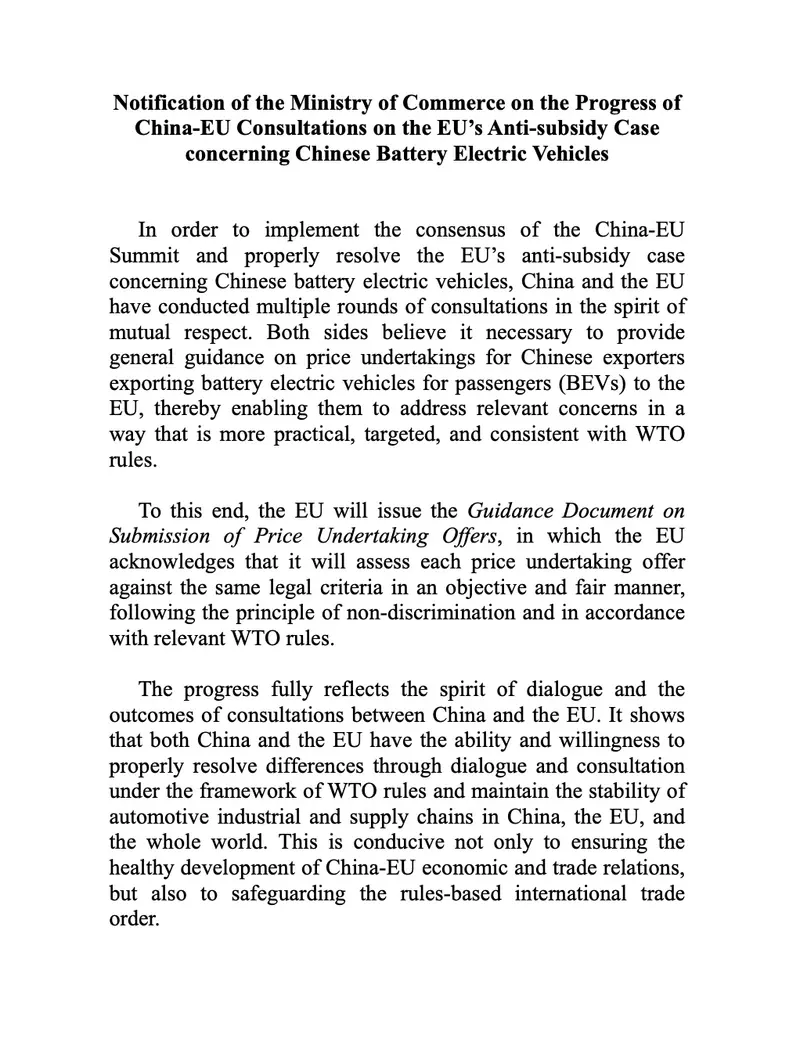 易车讯 为落实中欧领导人会晤共识,妥善解决欧盟对华电动汽车案,中欧双方本着相互尊重的态度,进行了多轮磋商。双方一致认为,有必要向对欧盟出口纯电动汽车的中国出口商,提供关于价格承诺的通用指导,以便中国出口商可通过更加实用、有针对性且符合世贸组织规则的方式,解决相关关注。