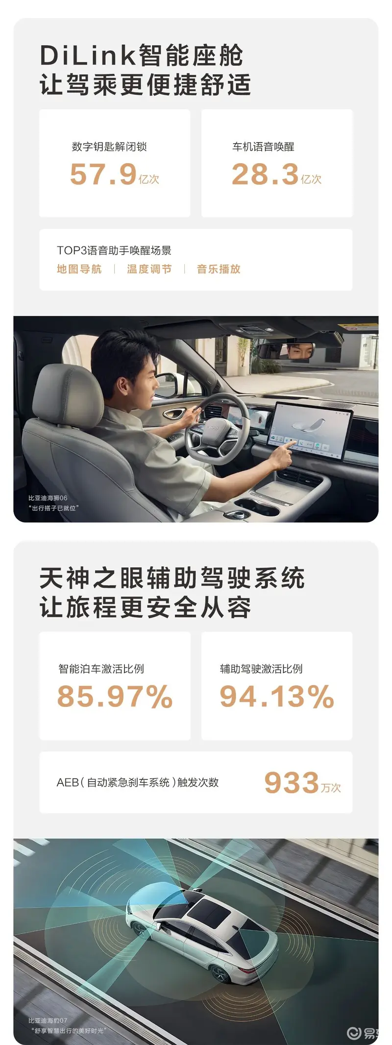 国内用户跨越山川湖海,自驾抵达全国370座城市,海外超110个国家和地区的用户选择比亚迪,共同为地球降温1℃。数字钥匙解闭锁57.9亿次,车机语音唤醒28.3亿次,智能泊车激活比例85.97%,辅助驾驶激活比例94.13%,AEB(自动紧急刹车系统)触发次数933万。
