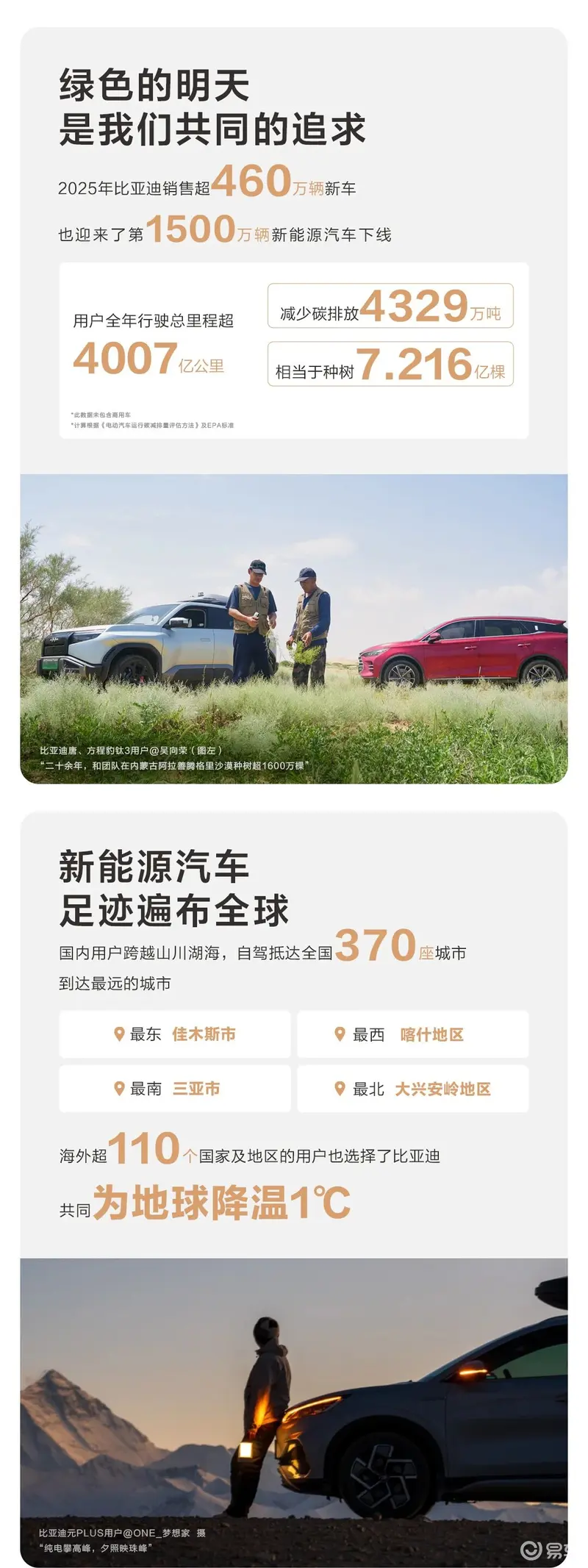 易车讯 1月12日,比亚迪发布了2025年用户年度出行报告,2025年比亚迪销售超460万辆新车,用户全年行驶总里程超4007亿公里,减少碳排放4329万吨,相当于种树7.216亿棵。