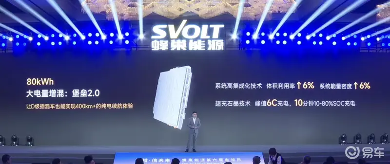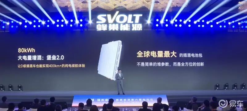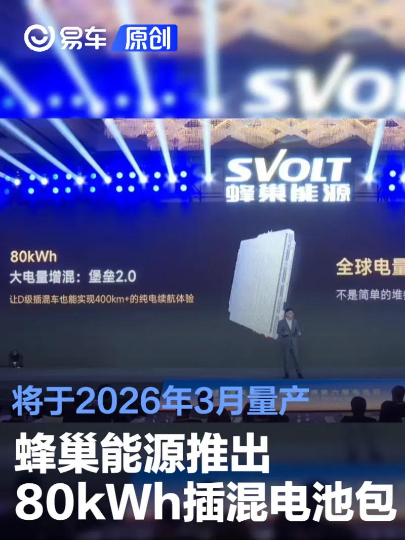 易车讯 1月13日,蜂巢能源在第六届电池日上宣布,针对全球家庭用车向大五/六座进阶带来的“大电量插混”需求推出了全球最大电量80kWh插混电池包“堡垒 2.0”。官方表示,“堡垒 2.0”将于2026年3月量产。