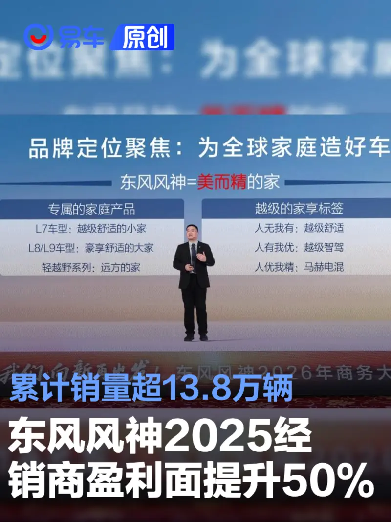 在以风神L8为核心、多款差异化车型满足不同家庭用户需求的产品布局下,东风风神2025年呈高质量逆势增长之势,业绩方面成果亮眼。东风风神2025年累计销量超13.8万辆,同比增长达37%,全年新增180家新终端门店,截止目前全国终端门店已达367家,值得关注的是,东风风神经销商盈利面全年大幅提升50%,销售网络的不断拓展与盈利面的健康增长,已形成东风风神品牌与渠道双向赋能的良性循环。