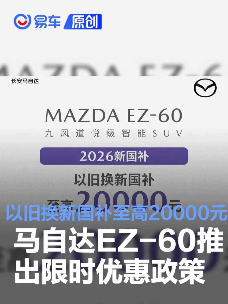 易车讯 日前,长安马自达官方发布2026新国补。购置马自达EZ-60可享以旧换新国补至高20000元,并推出限时三重礼,限时补贴礼,国补叠加补贴5000元,限时升级礼,选配基金3000元,限时金融礼2年0利息等。此次活动时间2026年1月1-31日。
