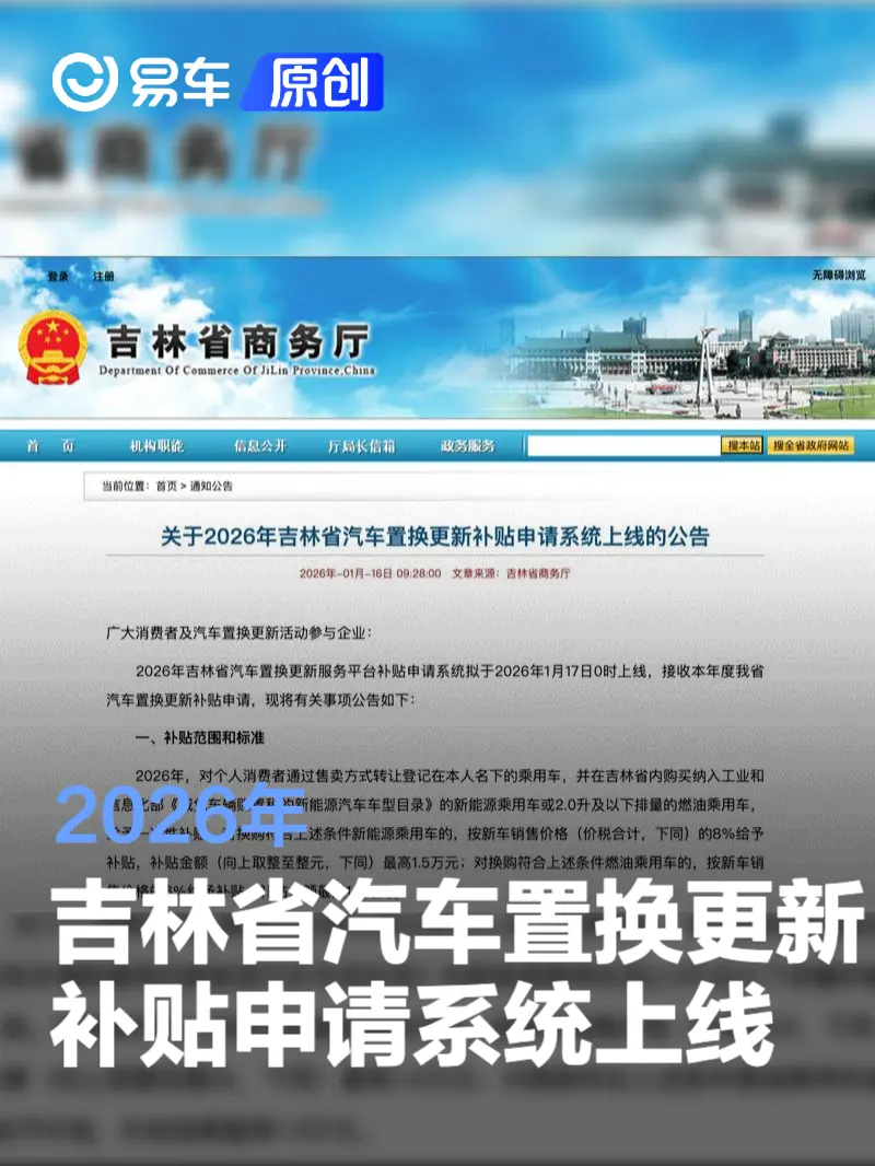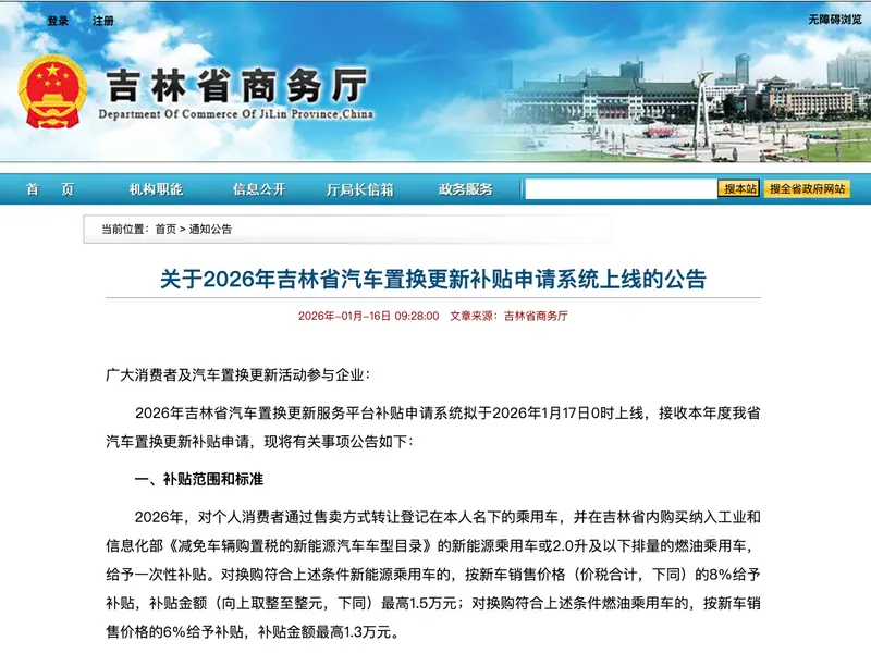 易车讯 1月16日,吉林省商务厅发布关于2026年吉林省汽车置换更新补贴申请系统上线的公告。2026年吉林省汽车置换更新服务平台补贴申请系统拟于2026年1月17日0时上线,接收本年度我省汽车置换更新补贴申请,现将有关事项公告如下: