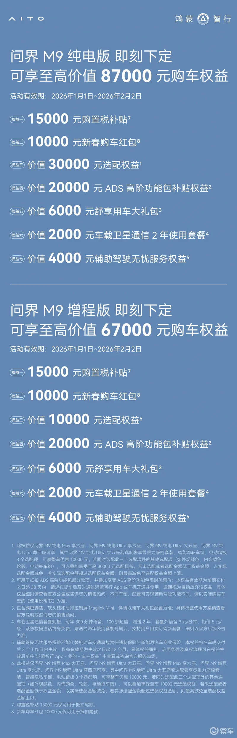 其中问界M9纯电版即刻下定可享至高价值87000元购车权益,包含15000元购置税补贴;10000元新春购车红包;价值30000元选配权益;价值20000元ADS高阶功能包补贴权益;价值6000元舒享用车大礼包;价值2000元车载卫星通信2年使用套餐;价值4000元辅助驾驶无忧服务权益。问界M9增程版即刻下定可享至高价值67000元购车权益,除了可享价值10000元选配权益,其余权益与纯电版保持一致。